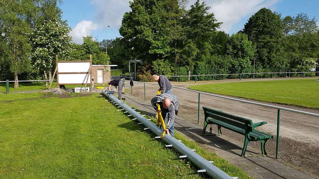 Bei den Arbeiten rund um unsere neue Flutlichtanlage geht es stetig weiter voran. In der letzten Woche wurden bereits die Fundamente fertig gestellt und der Beton gegossen. Am Sonnabend, den 7.04.18 gab es dann eine Baubesprechung mit allen Beteiligten und unserem Flutlichtlieferanten Licht und Ton Mühlbauer aus Usingen. Seit Mitte dieser Woche werden dann die Leitungen ( Kabel und Blitzableiter ) verlegt.